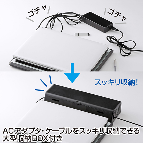 ●ACアダプタや周辺小物まで冷やすことのできる大型収納BOX付きノートクーラーパッド。