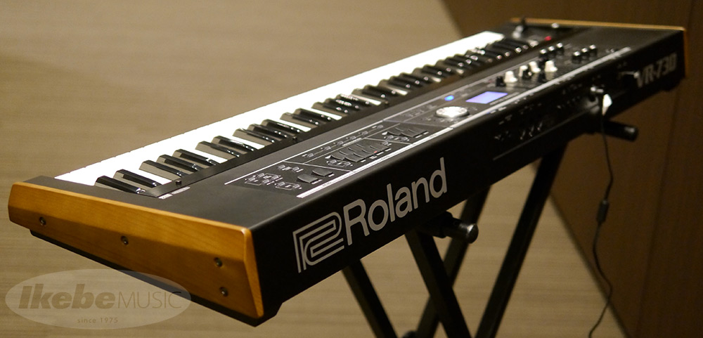 新たなV-Combo、VR-730です。実機は事前に公開されていた製品写真に比べて、エッジがシャープで実に精悍。正統派の丹精な佇まいを見せています。派手な色遣いではなく、あくまでプレイで魅せる、職人肌なキーボーディストに似合う印象ですね。