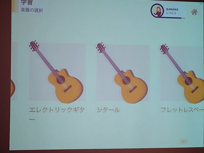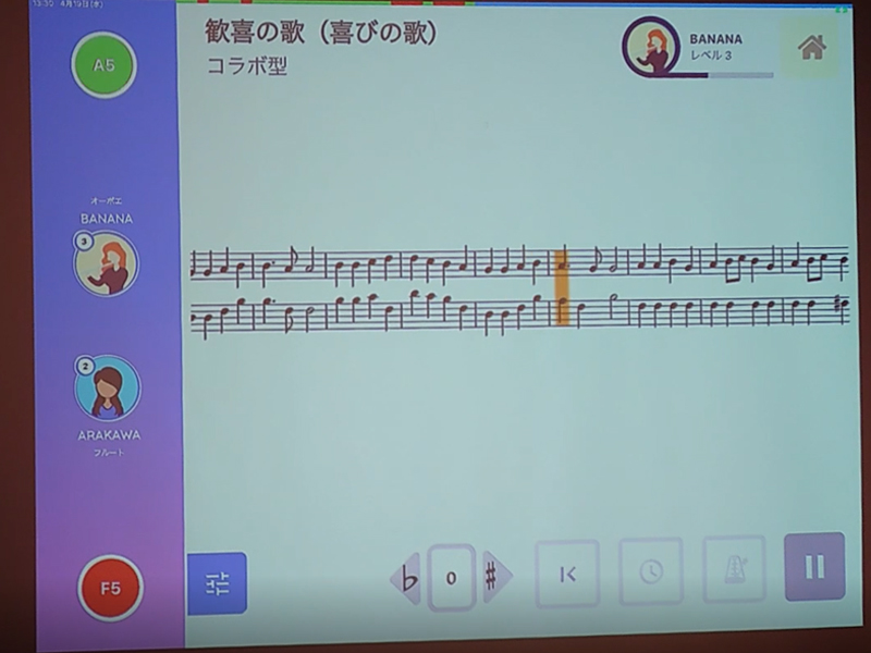 学習モードではアプリに内蔵されている曲が再生されつつ、画面に表示される楽譜に沿って演奏するモードで、演奏は採点されるようになっています。