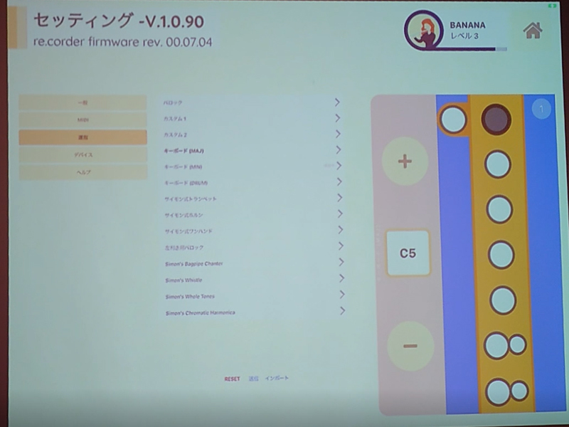 このカスタマイズ機能を利用して、デモンストレーターのBANANAsuさんは通常2オクターブ程度しか出せないリコーダーの音域を3オクターブまで出せるようにしていました。