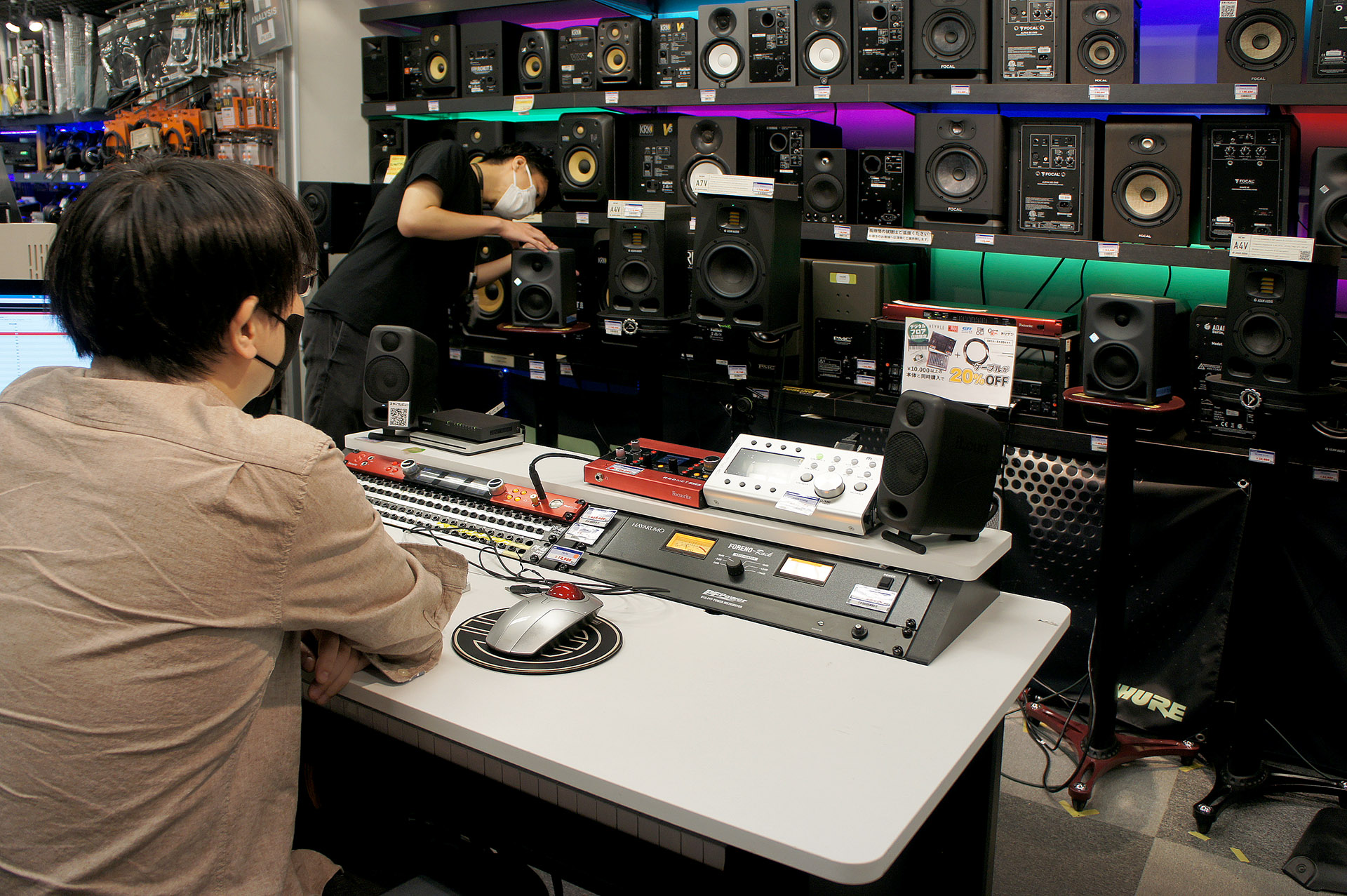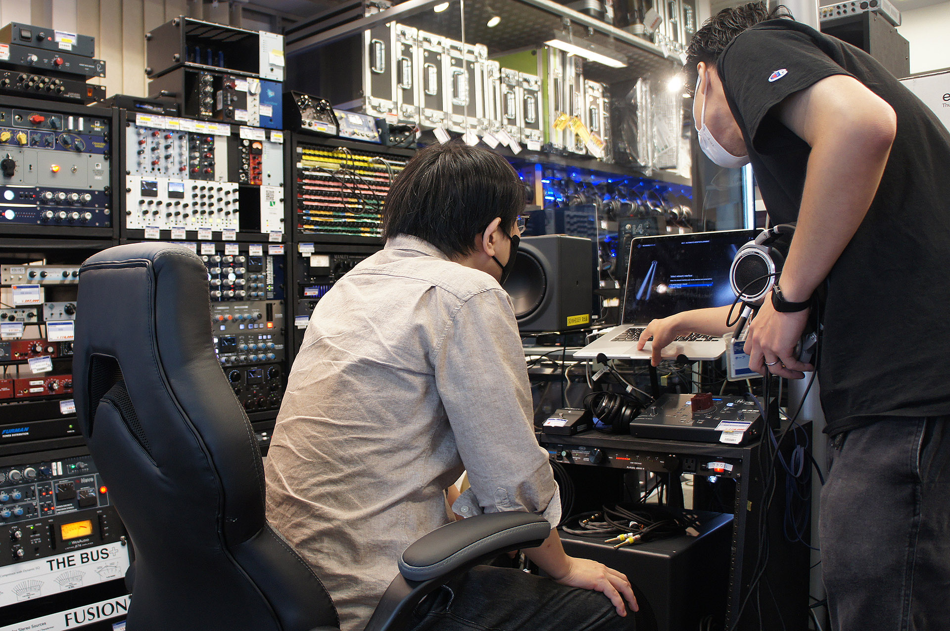 リニューアルしたスピーカーコーナー、ヘッドホンコーナーではモニター環境の話題などで大いに盛り上がりました。後編ではマイクコーナーにお立ち寄りいただきます。