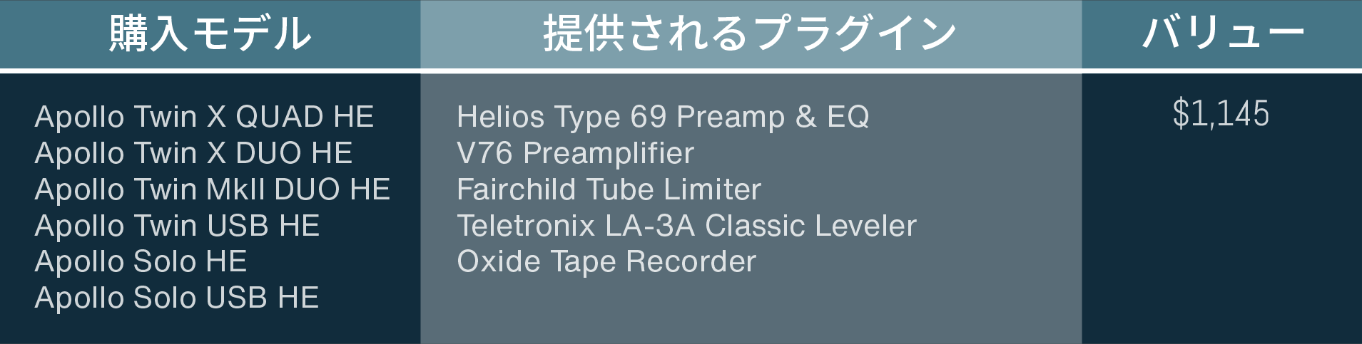 対象製品(後述)を国内正規販売店にてApollo Twin / Apollo Solo シリーズの “Heritage Edition” を新規購入の上、期間内に Universal Audio 社サイトのご自身のアカウントへ製品登録を行っていただくと、Fairchild、Teletronix、Helios、UA といった5つの UAD プラグインコレクション(合計 $1,145 相当分!)が無償提供されます。