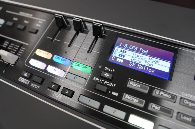 ライブで使えるキーボードとして、音色の素早いレイヤーや、スプリットが重要になる場面がありますが、CKシリーズはA、B、Cというボタンで構成されており、それぞれカラーがオレンジ、ブルー、グリーンと目で見ても管理しやすくなっています。液晶パネル上にあるA、B、Cが連動しており、CPやYCなどでもお馴染みのFM音源やサンプルシンセなどと組み合わせることができます。