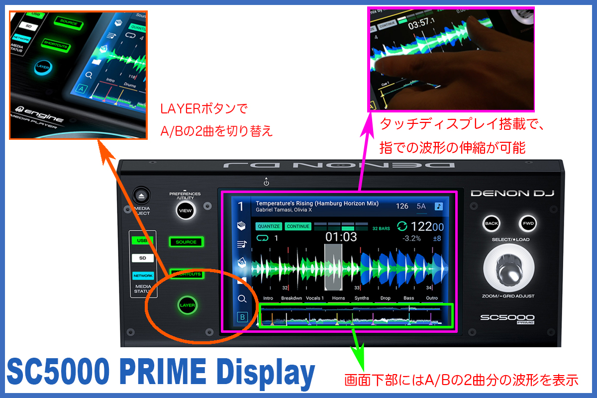 また、SC5000 Primeの大きな特徴の1つとして、レイヤーを切り替えて1台で2曲分の操作ができます!