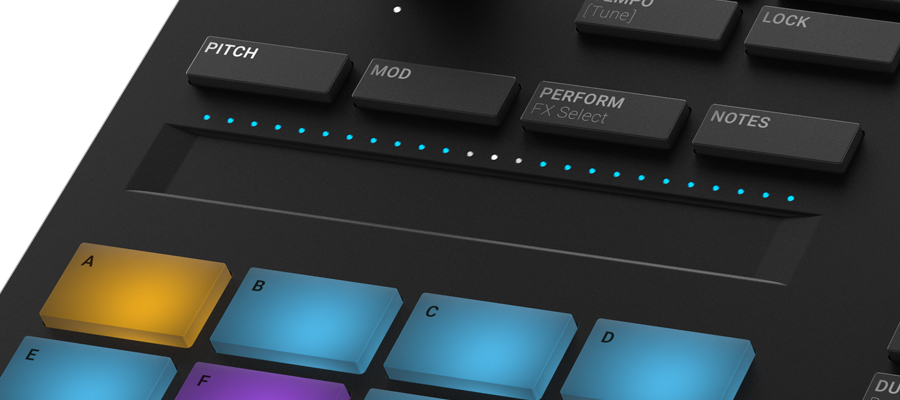 16個のPADのすぐ上に用意された、PADの4種のプレイモードの切り替えボタン。動画では、そのプレイの様子をご覧頂けます!