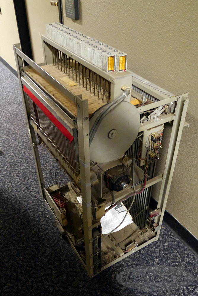 続いて通路に放置(?)されていた謎のマシン。磁気テープを鍵盤で演奏する「元祖サンプラー」、メロトロンの元となった楽器「チェンバリン」の内部フレームです。正確にはメロトロンに権利等を譲渡後のMシリーズかと思われますが、モデルは特定できませんでした。また、内部に故ロバート・モーグ博士のサインが入っているそうです。