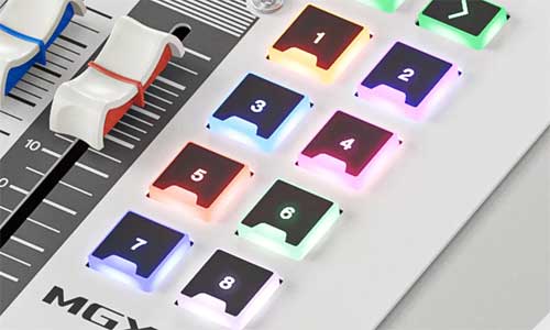 MGX本体右前方にある4つのノブと8つのパッドは、ユーザーが自由に設定できるカスタマイズ可能なキーとしても機能します。これらは4つのバンクに割り当てて管理でき、用途に合わせて柔軟に設定できます。例えば、サウンドパッドのトリガー、シーンのリコール、会場のサウンドチェック用に内蔵オシレーターからテストトーンを再生する、といった操作が行えます。