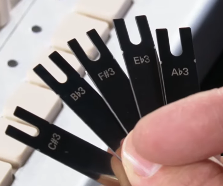本体付属品の中に交換用レゾネーターが5枚入っていますが、本体に最初から付いている物とは音程が異なります。予備パーツ用ではないのでご注意ください。交換してチューニングすればレゾネーターのスケールを調整する事も可能です。