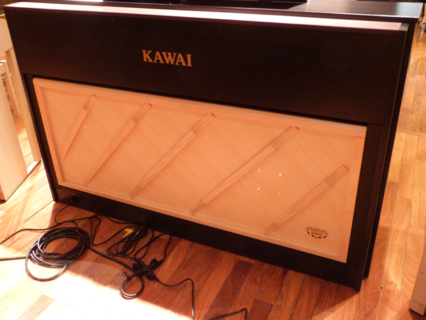 CAシリーズの中でも最上位モデル「CA98」には、響板スピーカーシステムが搭載されています。実際のグランドピアノにも使われている響板をアップライトピアノに組み込んだ形で使われており、背面は画像のような見た目になっています。