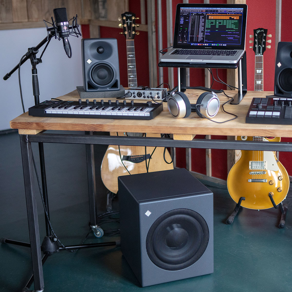前述の通りKH 80 DSPの再生能力が高いといっても57Hz以下の低域を再生することはできません。EDMなど超低域を多く扱う音楽が多い場合や、仕事でミキシングやマスタリングを行う場合、劇伴や効果音など、ワイドな再生能力を求める場合はサブウーハーKH 750 DSPを追加すると良いでしょう。