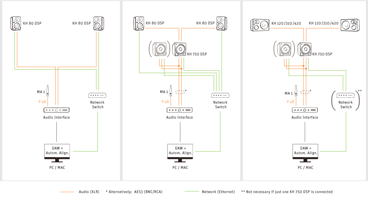 使用にあたっては測定が必要です。パソコンとイーサネットハブ(別売)、KH 80 DSPをLANケーブルで接続し、MA 1測定用マイク(別売)をオーディオインターフェースに接続。スイープ信号と呼ばれる測定用の信号をスピーカーから出力し、MA 1マイクで測定を行います。慣れていれば15分程度の所要時間。完了すると、スピーカーから出てくる音が、測定結果をもとに部屋にあわせた最適な特性に調整されます。