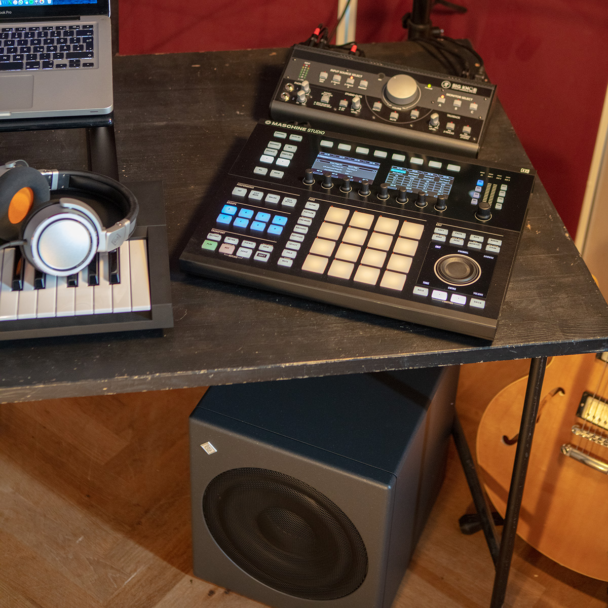 <机の下にあるスピーカーがサブウーハーKH 750 DSP>