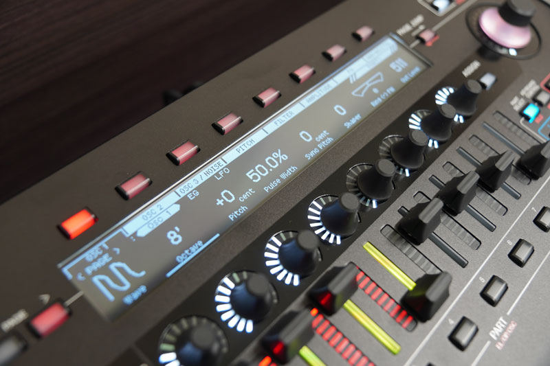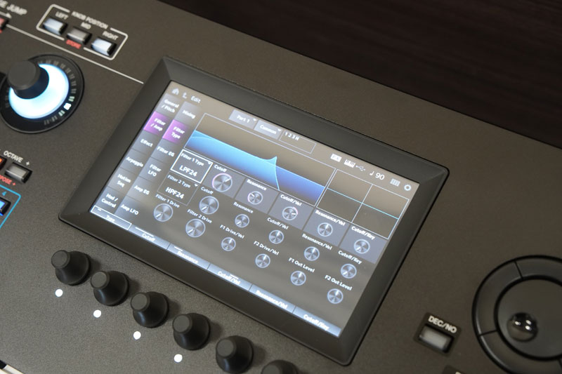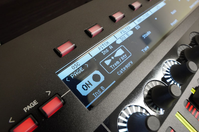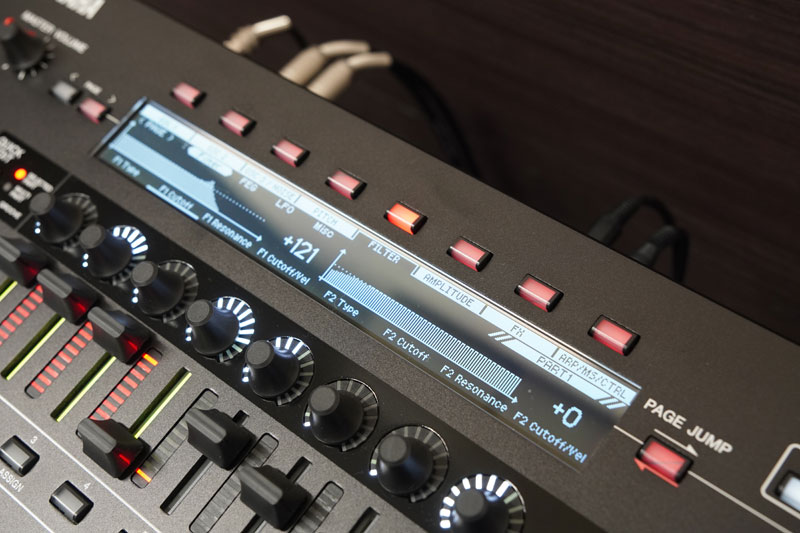 これによる操作性の向上は圧倒的。アサインされたパラメーター名や値がグラフィカルに表示されているので、初見でもノーストレス。フィルターのカットオフ/レゾナンスの様子がノブの動きにグリグリ追従する気持ちよさは、これだけでご飯3杯イケます。ディスプレイ上のボタンや左のページボタンでソフトノブの役割は直ぐに切り替えられるので、慣れてしまえば音色のエディットはこれまで経験したことのないスピード感で進められます。