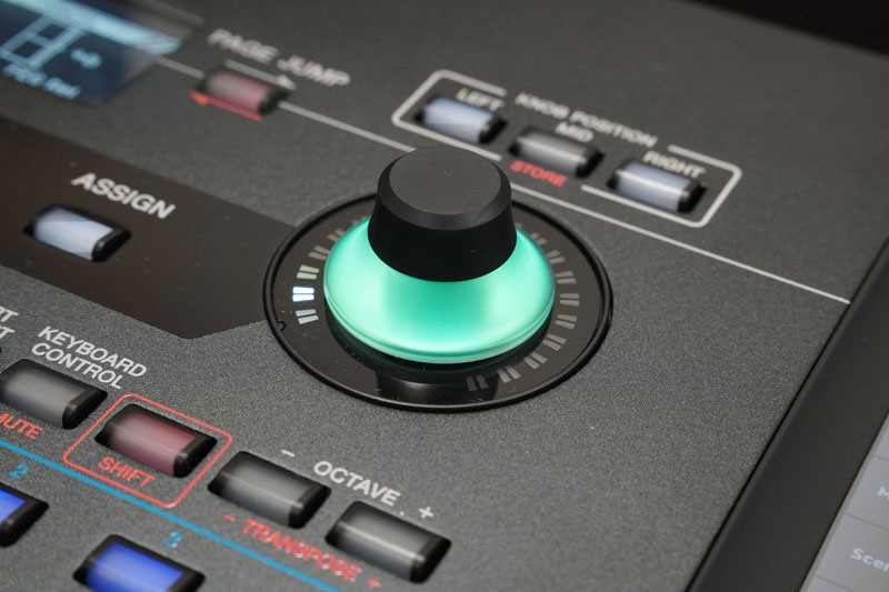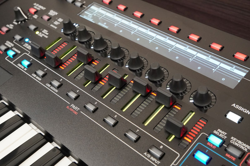 パネル上のボタンの多くは自照式。ソフトノブやスライダーにもマルチカラーLEDが搭載されています。このLEDは選択した機能により発光色が変化するため、例えば現在スライダーに割り当てられた機能がパートボリュームなのか、音色内のエレメントのボリュームなのか、等が直感的に判断することができます。