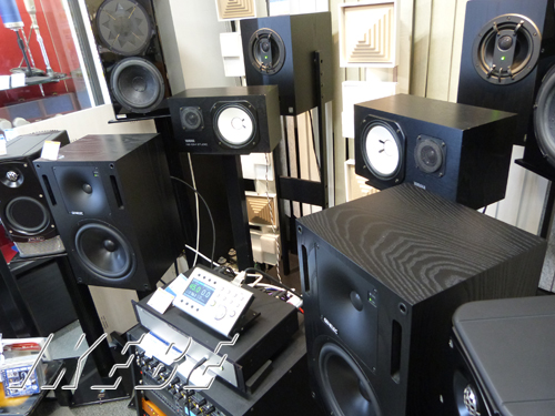 主要ブランド製品をずらりと並べての試聴スタンバイしている当店頭のスピーカー・セレクション。
