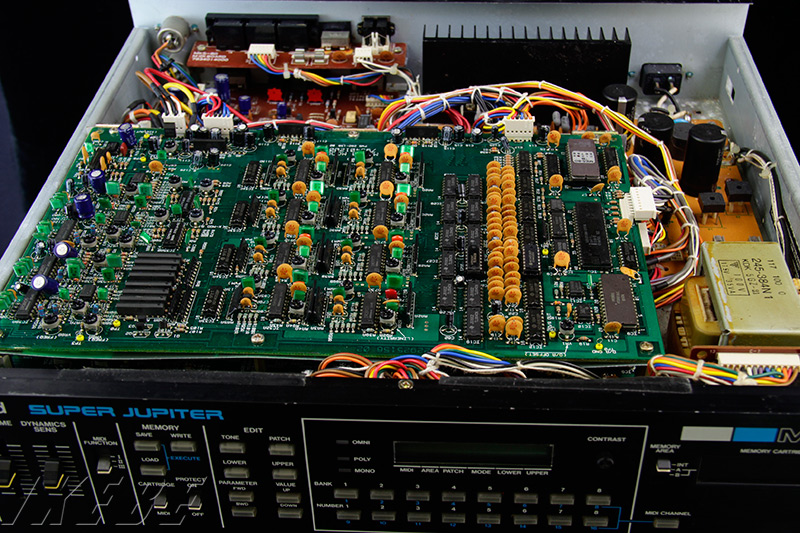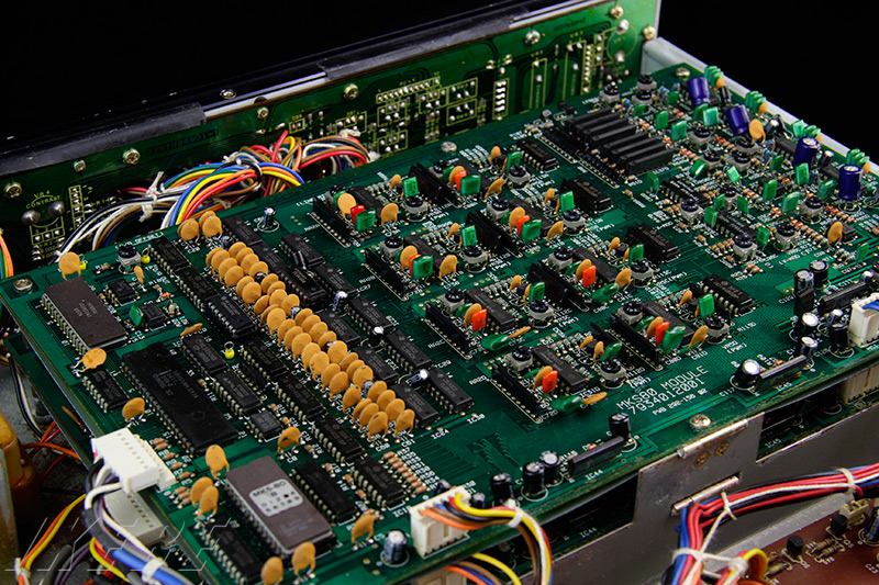 とにかく、奥行き長めな2Uサイズの筐体にギッシリ詰め込まれた基板のレイアウトが男心にグッとキますね。この緑色の音源回路が組み込まれた基板は2段重ねになっており、1枚で4ボイス分を担当しています。