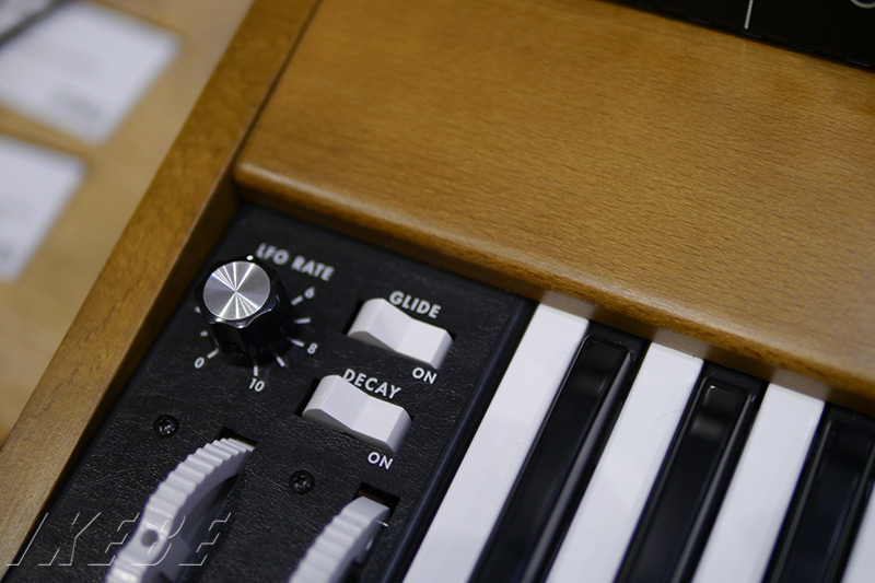 演奏時に目にする部分で異なる点が、このベンダーボックス奥のLFO RATEノブ(と直上の関連したルーティングスイッチ)。オリジナルはここに右側のGLIDE/DECAYをそれぞれコントロールするフットスイッチ端子が用意されていました。しかし端子サイズが特殊なため、Mimimoogユーザーの95%以上が使ったことの無い端子として有名です(当方脳内調べ)。端子を撤去した穴を増設LFOコントロールに流用する改造も多く見られますが、それに倣った感じですね。