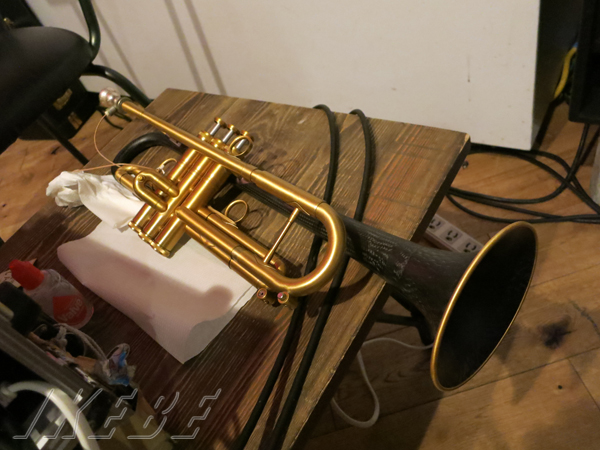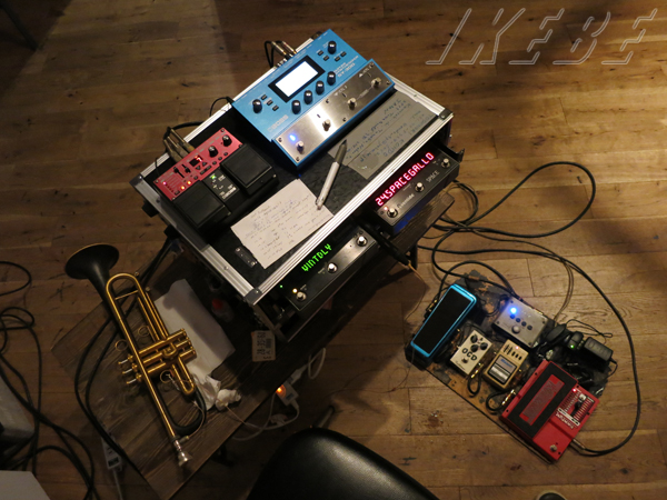 両日の近藤さんのエレクトリック・トランペット・キットは、ここしばらくの定番機材群を中心にセットされていました。