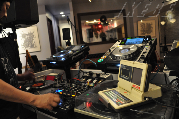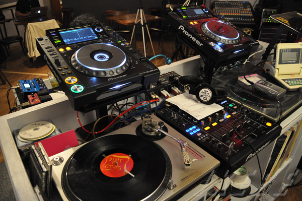 アナログ・ターンテーブル、CDJの他、80’sなスピーク・マシン『Talking Whiz-kid』の姿も!