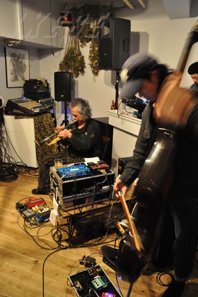 4月16日のセッションでは、両日出演の近藤等則さん、DJ YAMA a.k.a SAHIBさん。両名に加え、大阪よりベーシスト 守家 巧さんがコンパクトなAmpeg Baby Bass持参で参加!