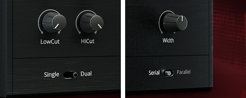 —- 『Diffusion』は、物理的には非現実的な空間のディレイですね。『REPLIKA XT』には、そうした5つのディレイ・モードのディレイをシングル/デュアル(単体使用/2基同時使用)で切り替えて使用出来、デュアル時には、接続モードもシリアル/パラレル(直列/並列)を選択して使用出来ます。