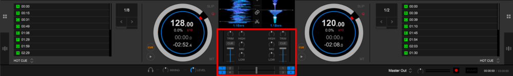 ミックスをするには、ミキサーが必要です。一般的にDJミキサーは、音質を調整する「EQ」、ボリュームを調整する「ボリュームフェーダー」、チャンネルを切り替える「クロスフェーダー」から構成されるが、DJコントローラーにはそれらの機能が装備されています。