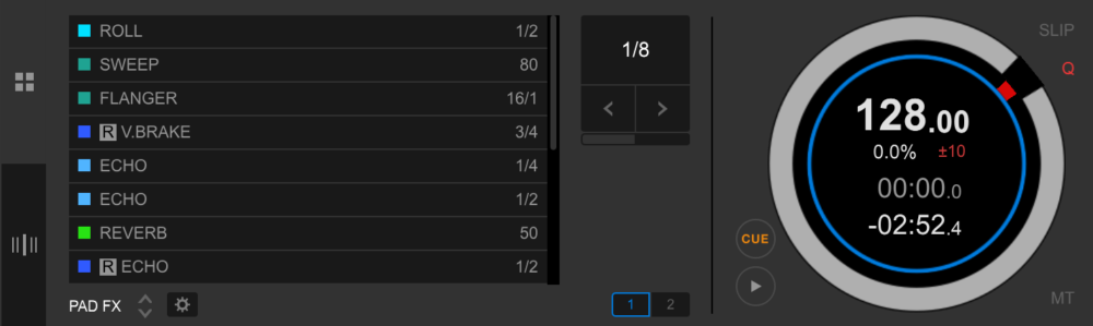 パッドエフェクトでは、パフォーマンスパッドを押すだけで、簡単にエコーやリバーブ、ロールなどの多彩なエフェクトを加えることができるので初心者には易しいです。8個のパフォーマンスパッドに、異なるエフェクトをアサインできるので、いちいちエフェクトを入れ替える必要もありません。