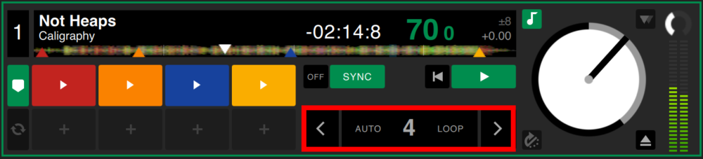 続いては、ループを自動で設定できるオートループ機能です。ループとは楽曲の任意の箇所を、設定した長さで繰り返し再生させる機能になります。ループは通常、ループの開始ボタンと終了ボタンを押して設定します。しかしオートループでは、ループを開始するポイントで機能をオンにするだけで拍の設定とENDの設定までしてくれる機能なのです。